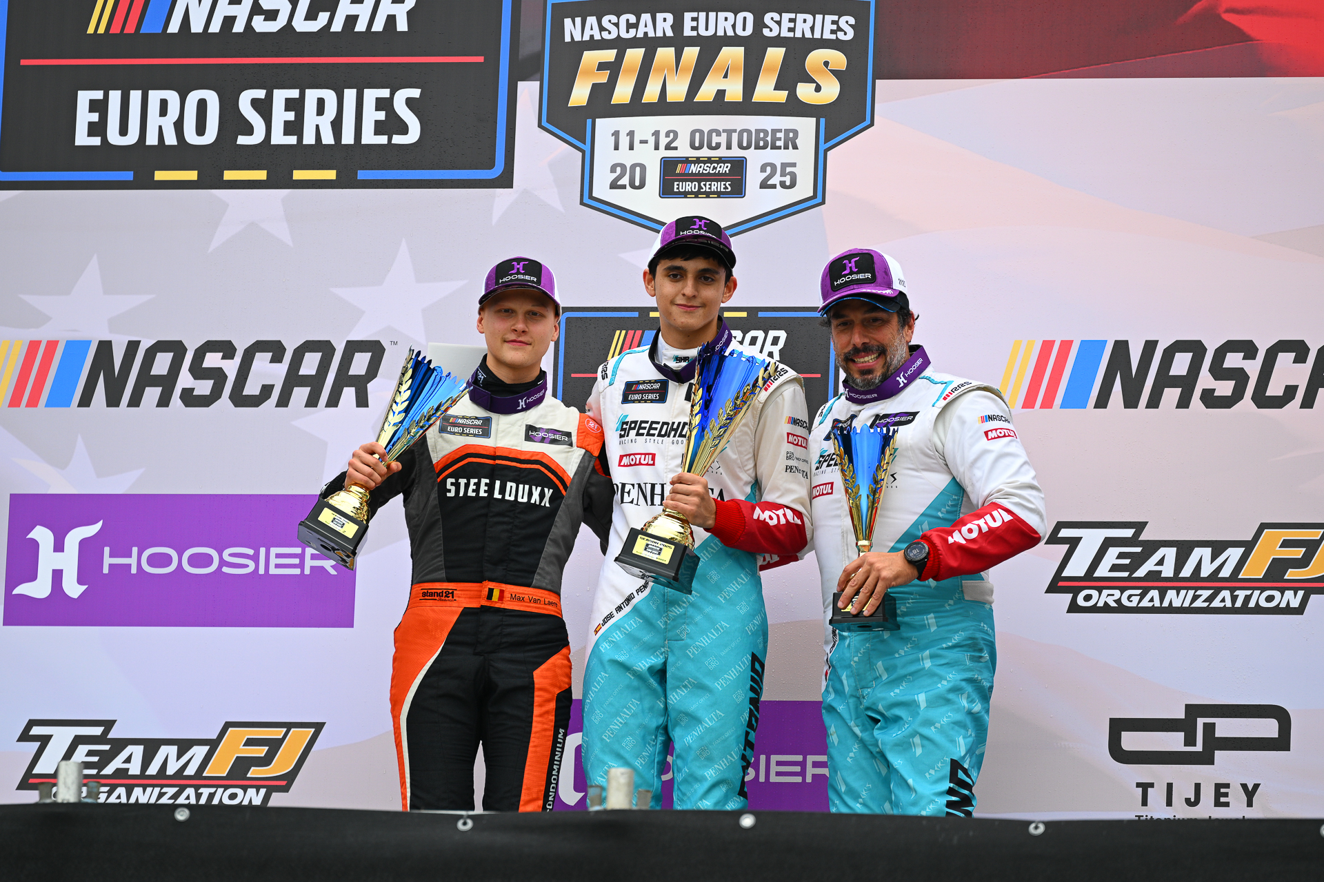 Nuno Caetano (right) stands as part of the 2025 EuroNASCAR Rookie Challenge's top-3 overall drivers
