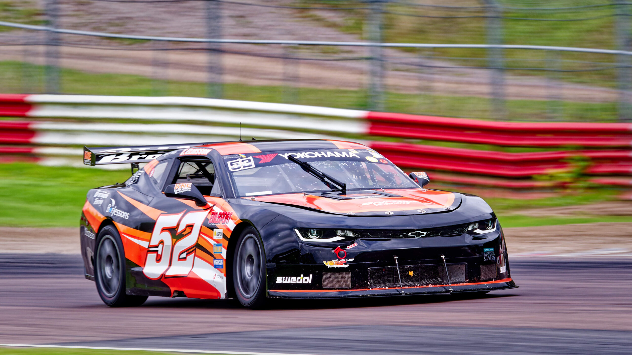 Tommie Elliason, the newly crowned V8 Thunder Cars champion, races his #52 Chevrolet Camaro at Mantorp Park in 2025